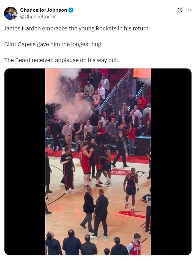 赛后哈登跟火箭队的每一个年轻球员都进行了拥抱致意,他跟克林特-卡佩拉的拥抱时间最长,卡佩拉与哈登都是在休斯顿发迹,卡佩拉生涯最大的合同五年9000万也是在哈登的帮扶下拿到,这两人的感情很好。